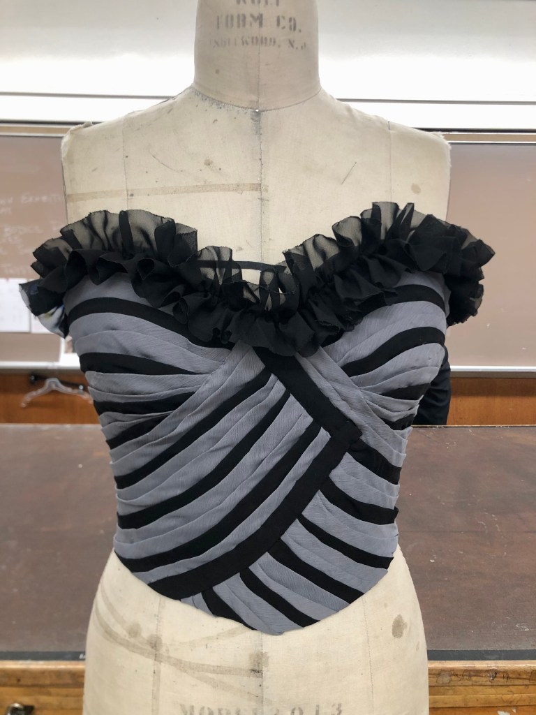 Boned bodice with chiffon fluting.