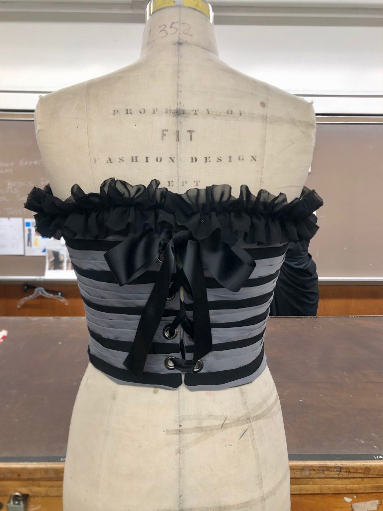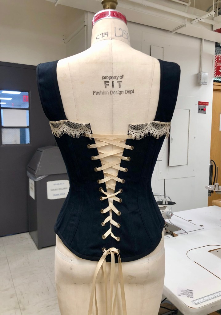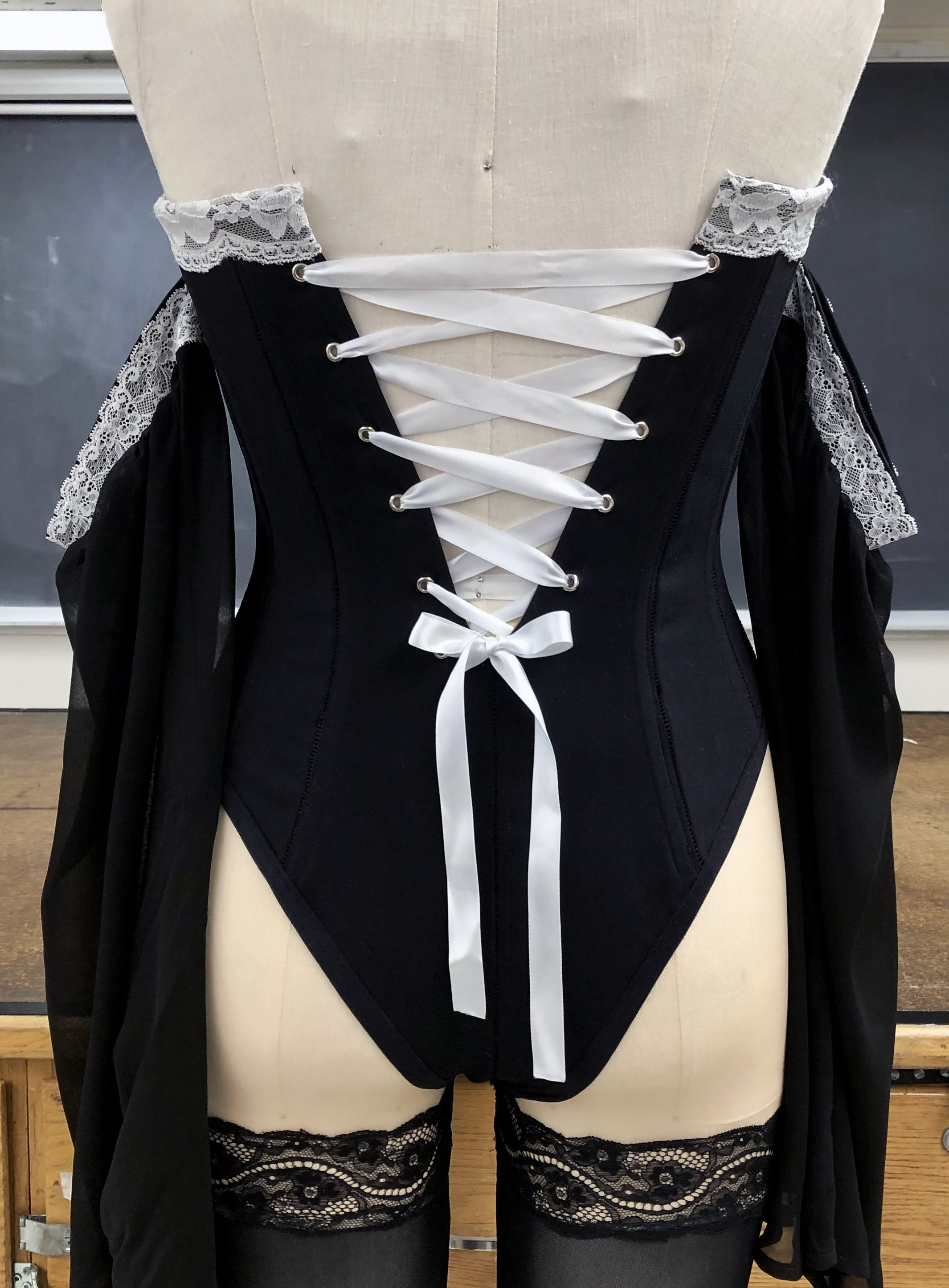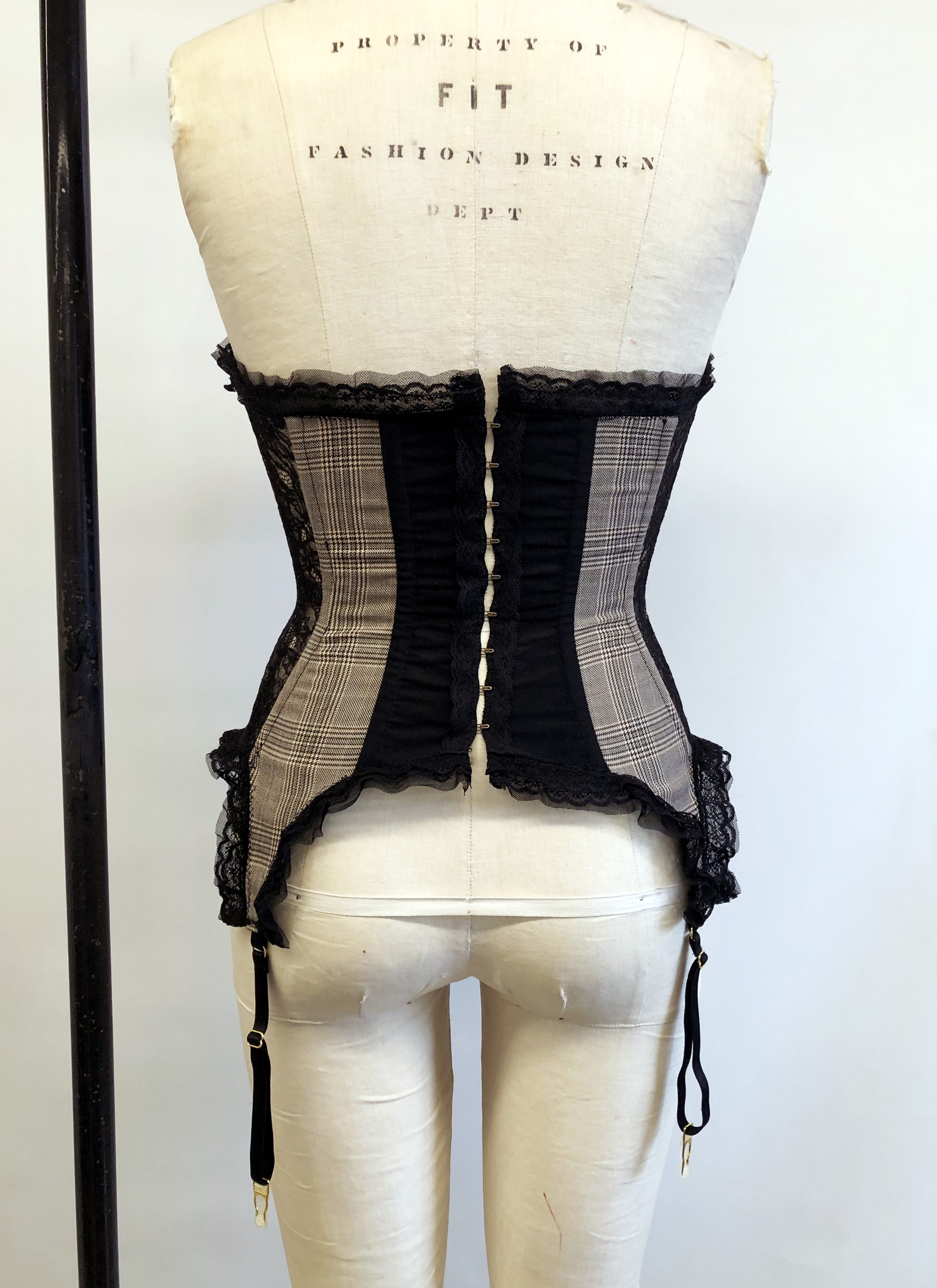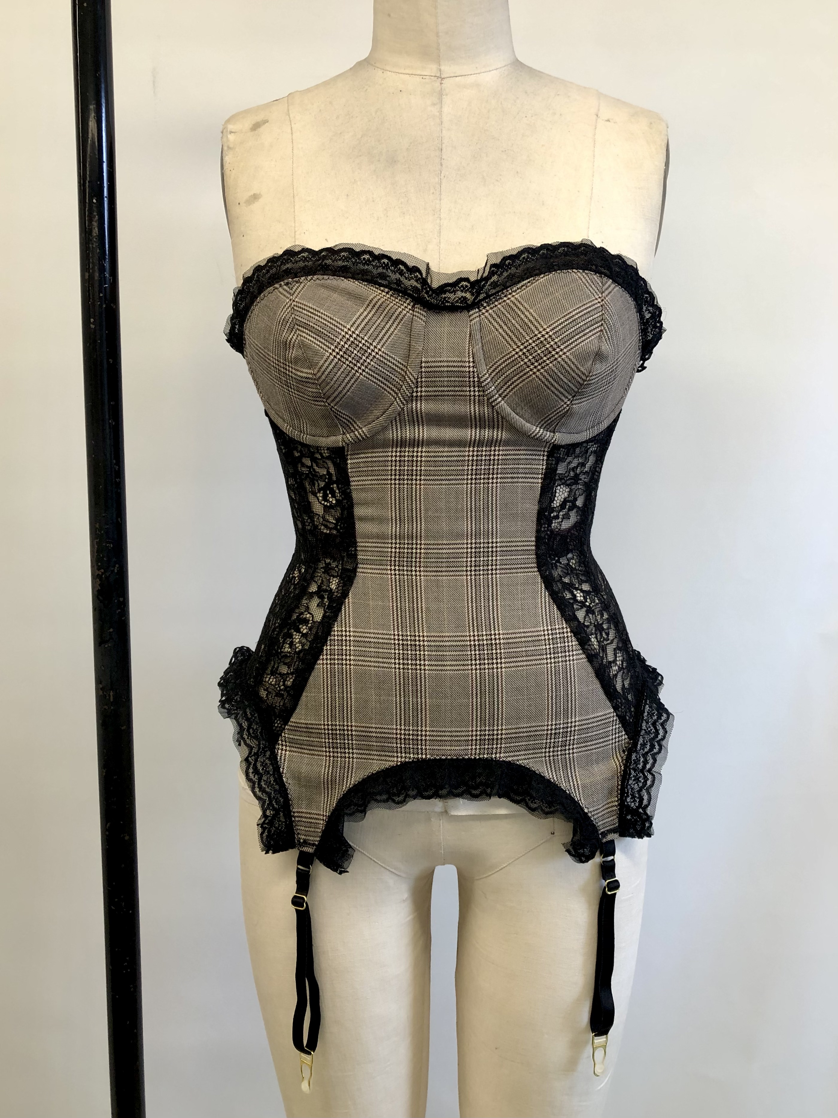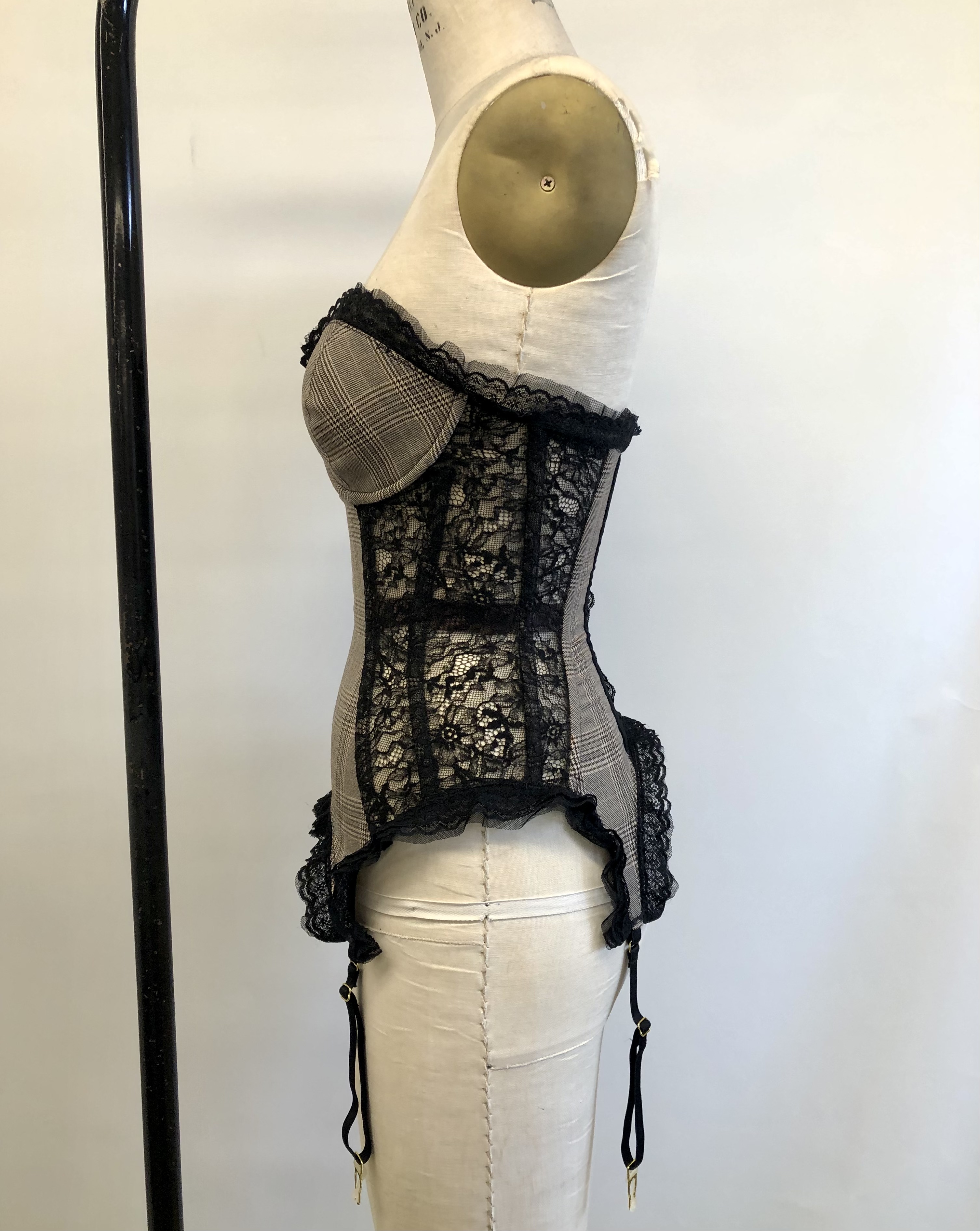 Bustier, made with wool suiting, lace, power mesh, lace trim, and spiral steel boning.