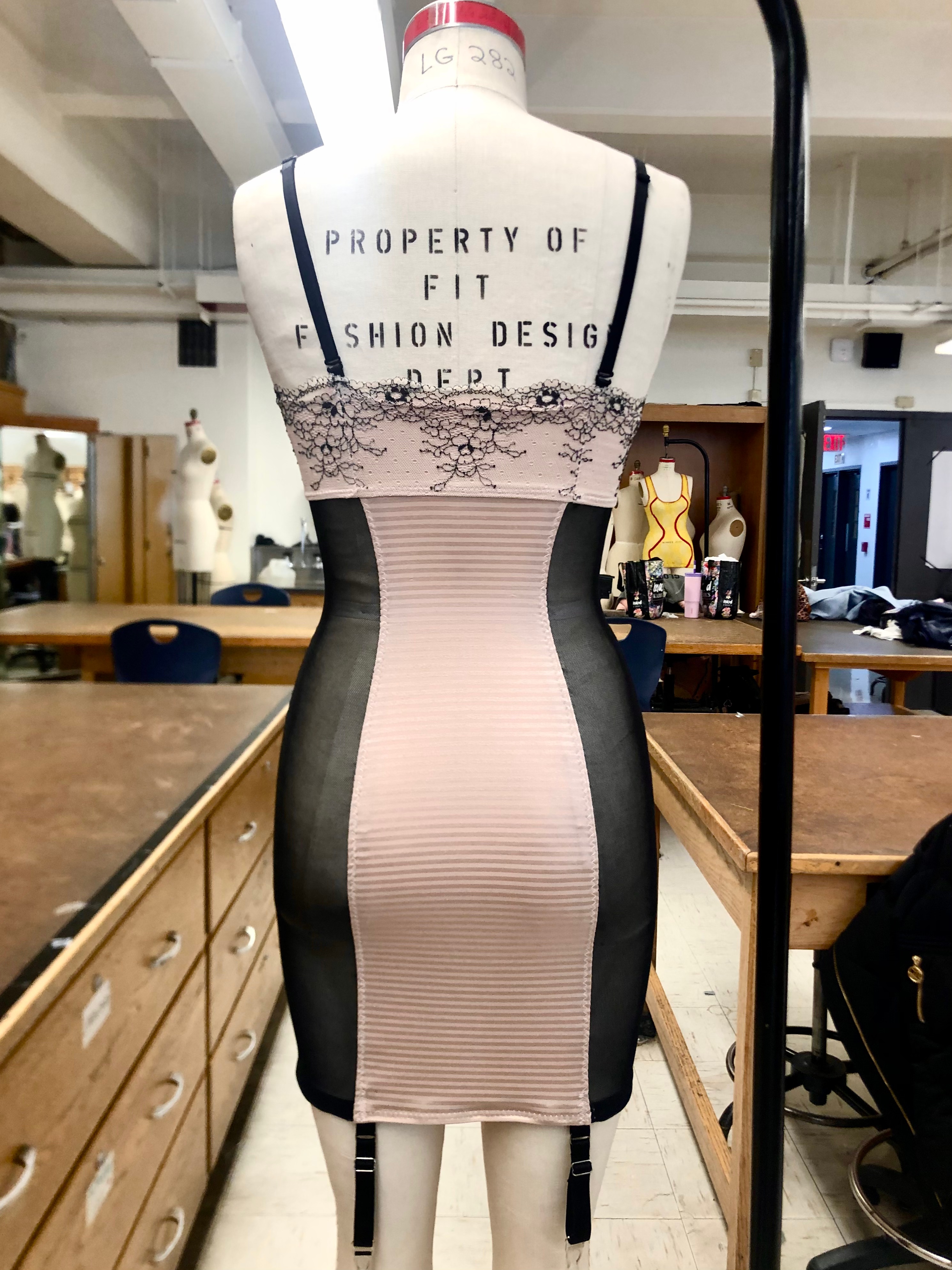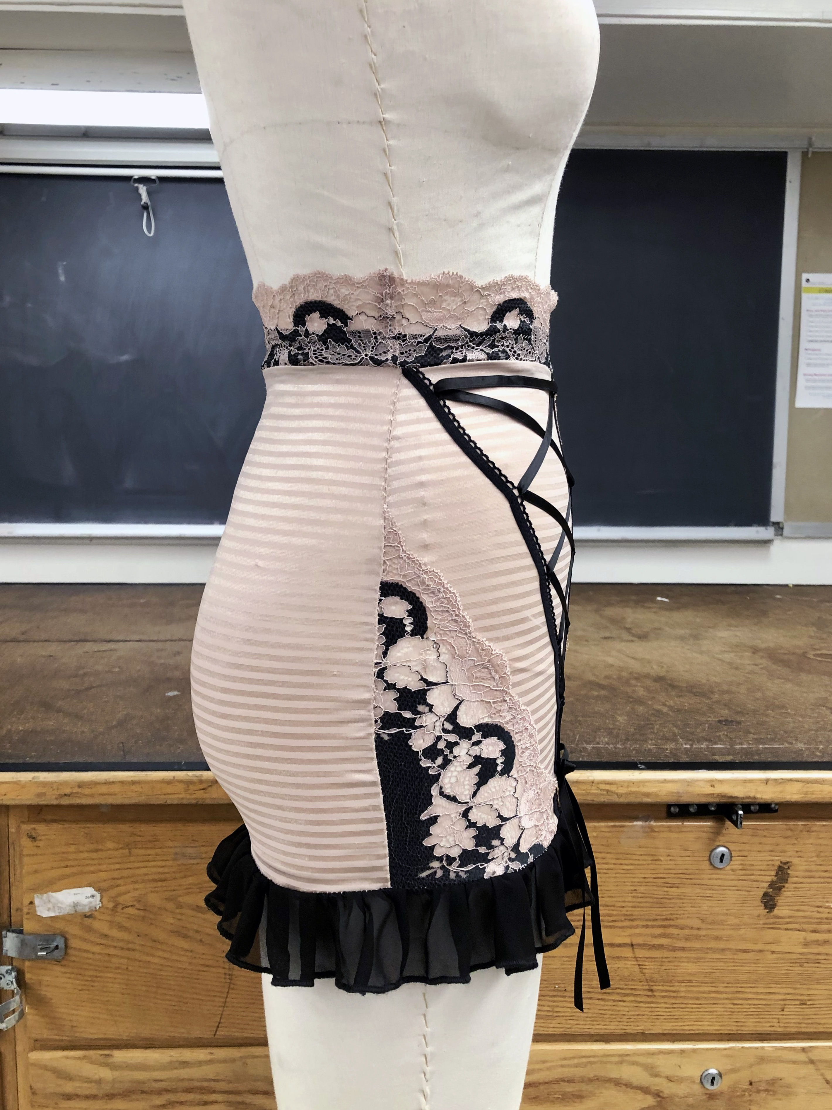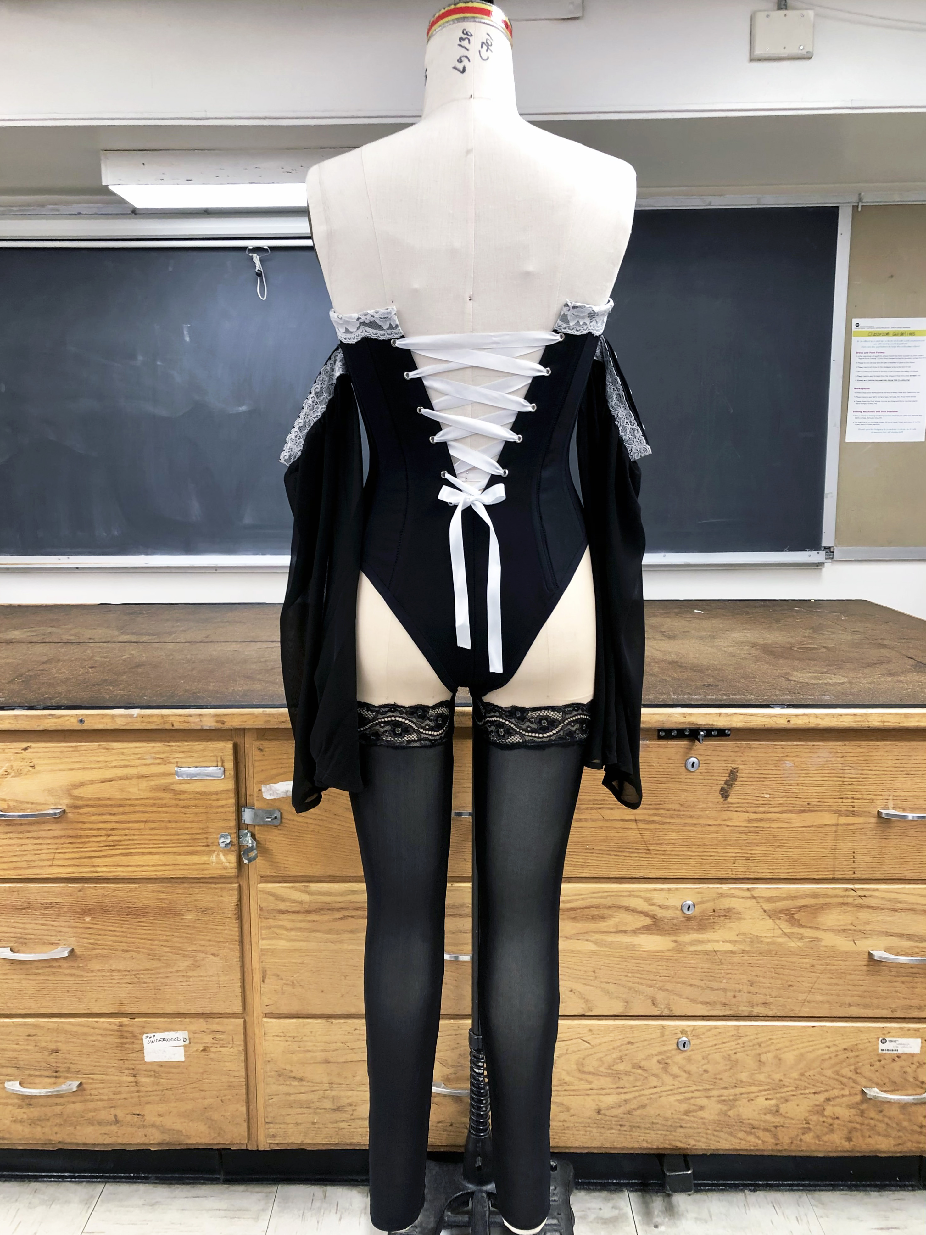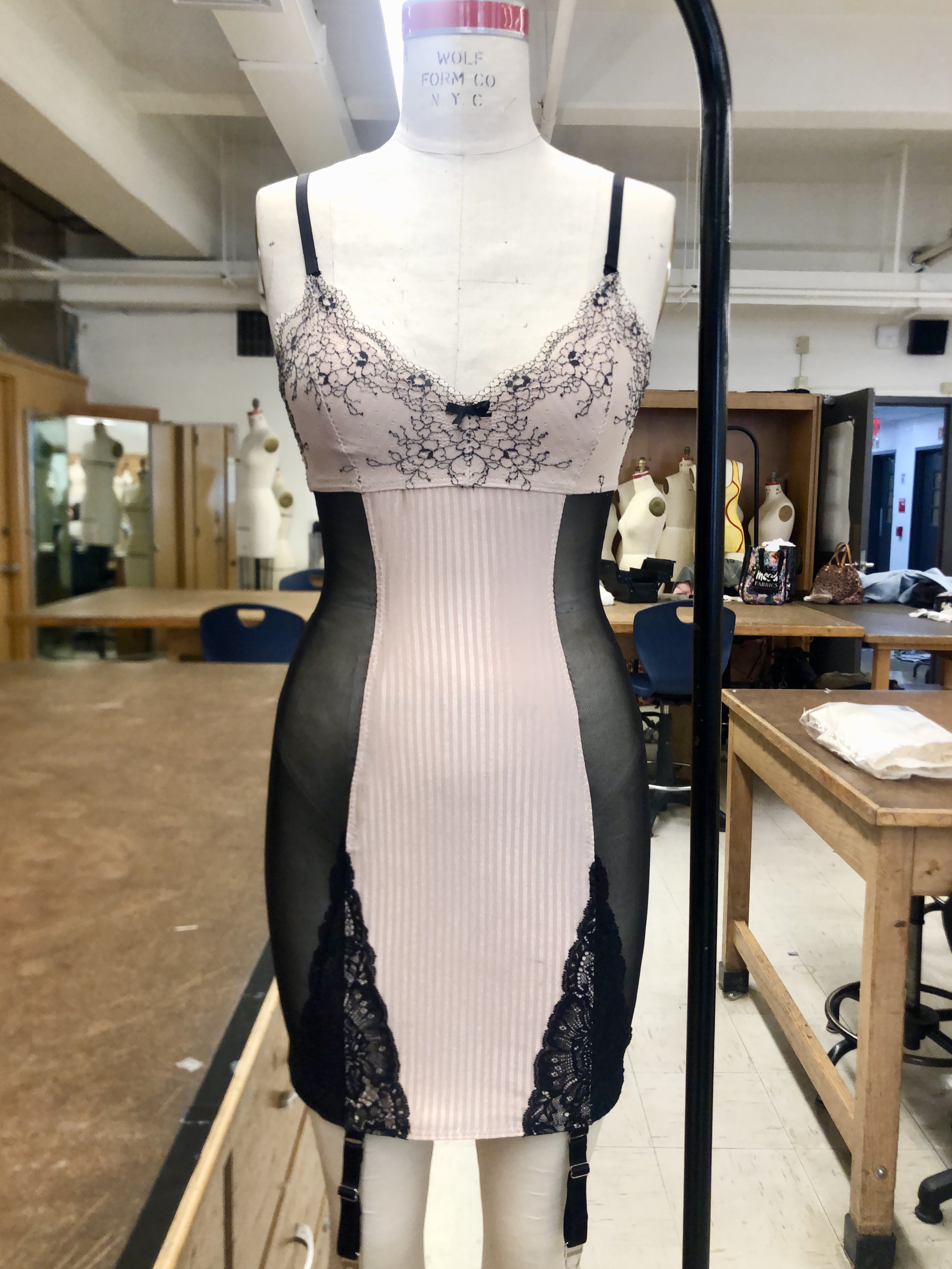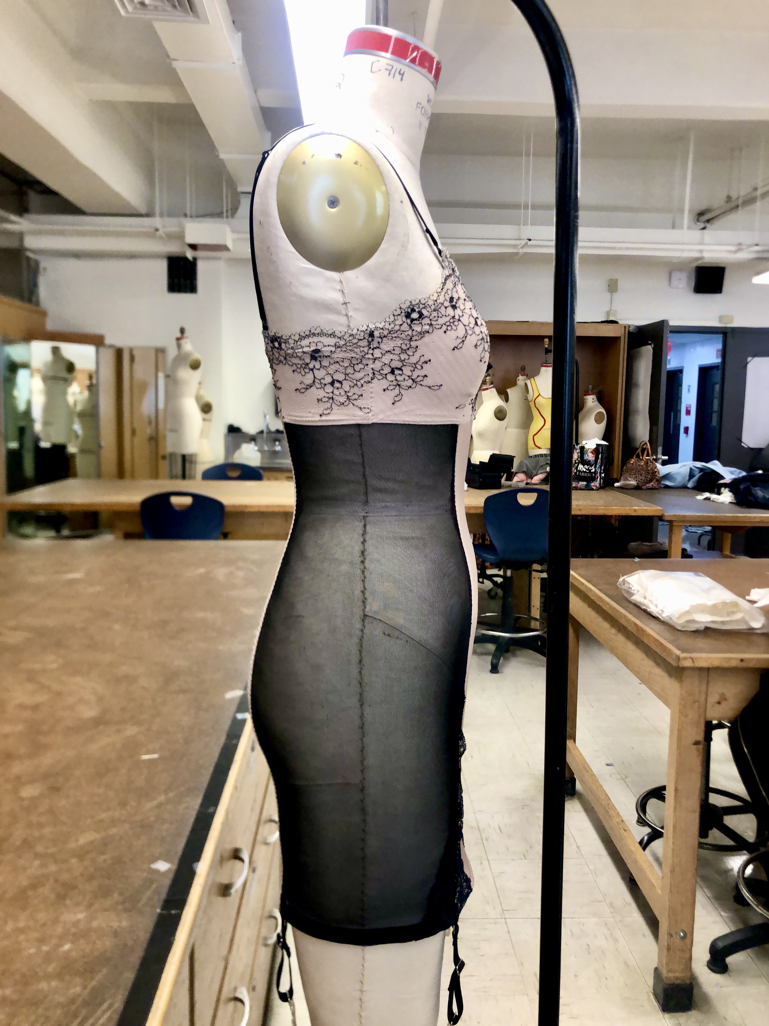 Bustier, made with wool suiting, lace, power mesh, lace trim, and spiral steel boning.