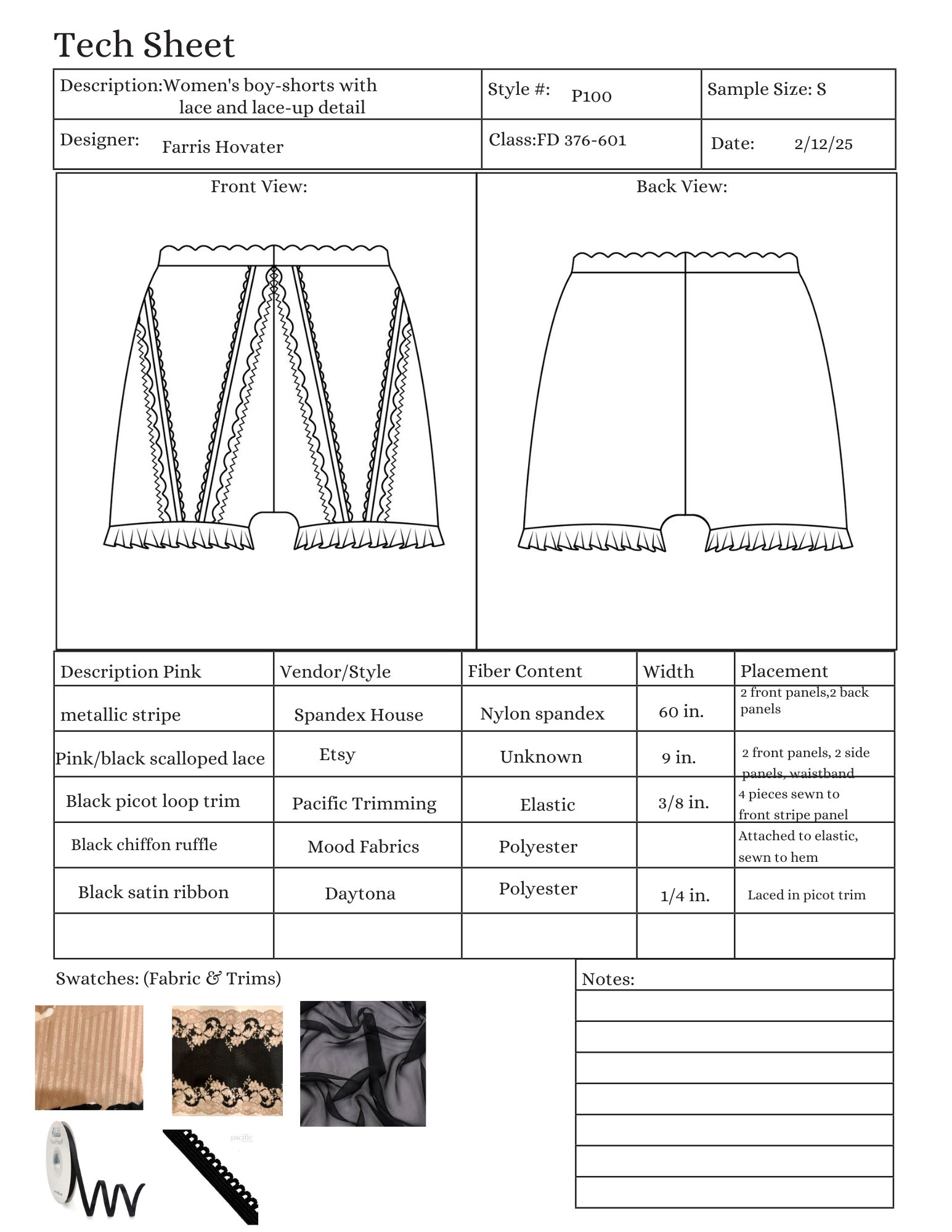 Boy shorts, made with spandex, polyester chiffon, galloon lace, and picot trim.