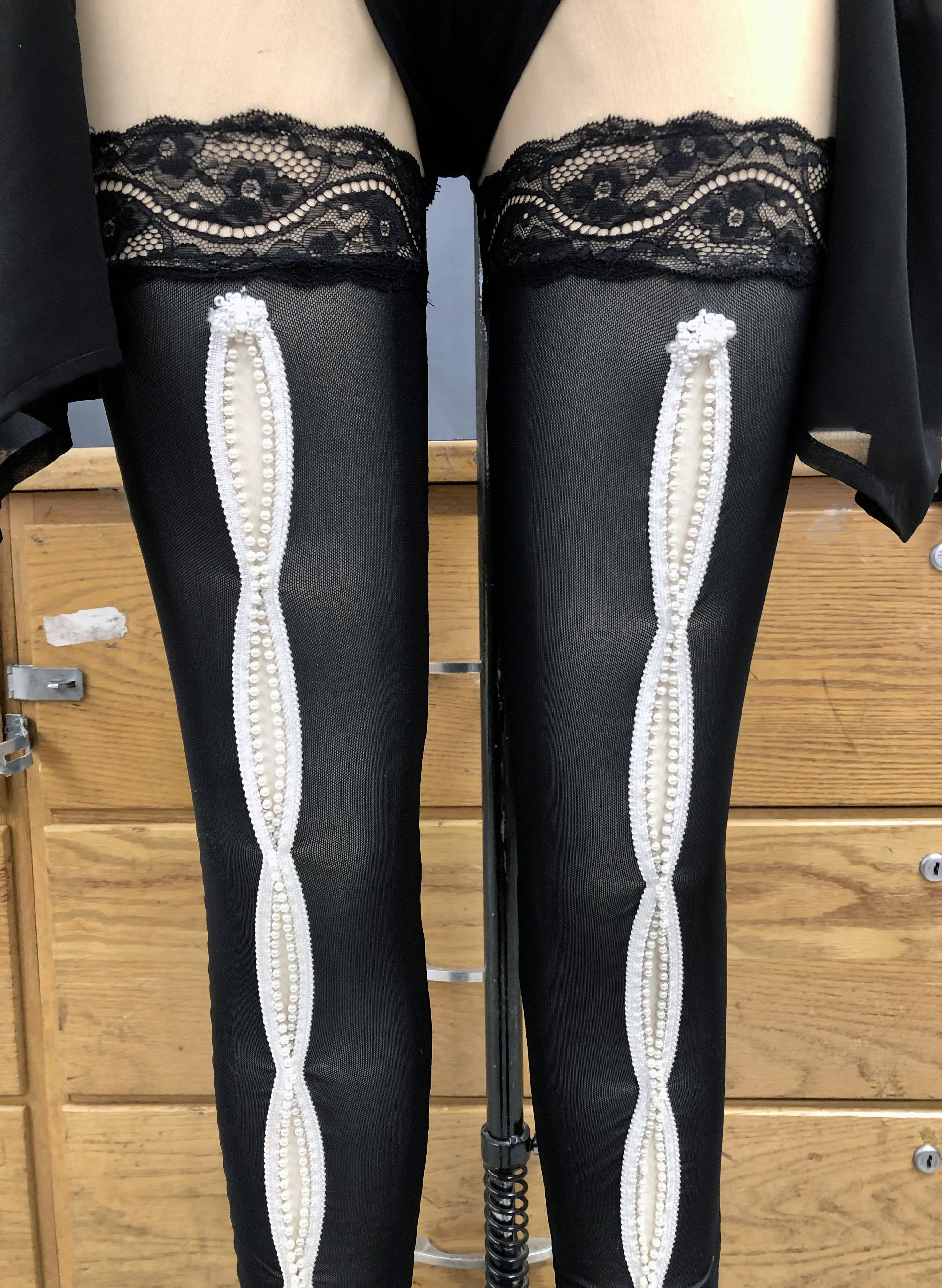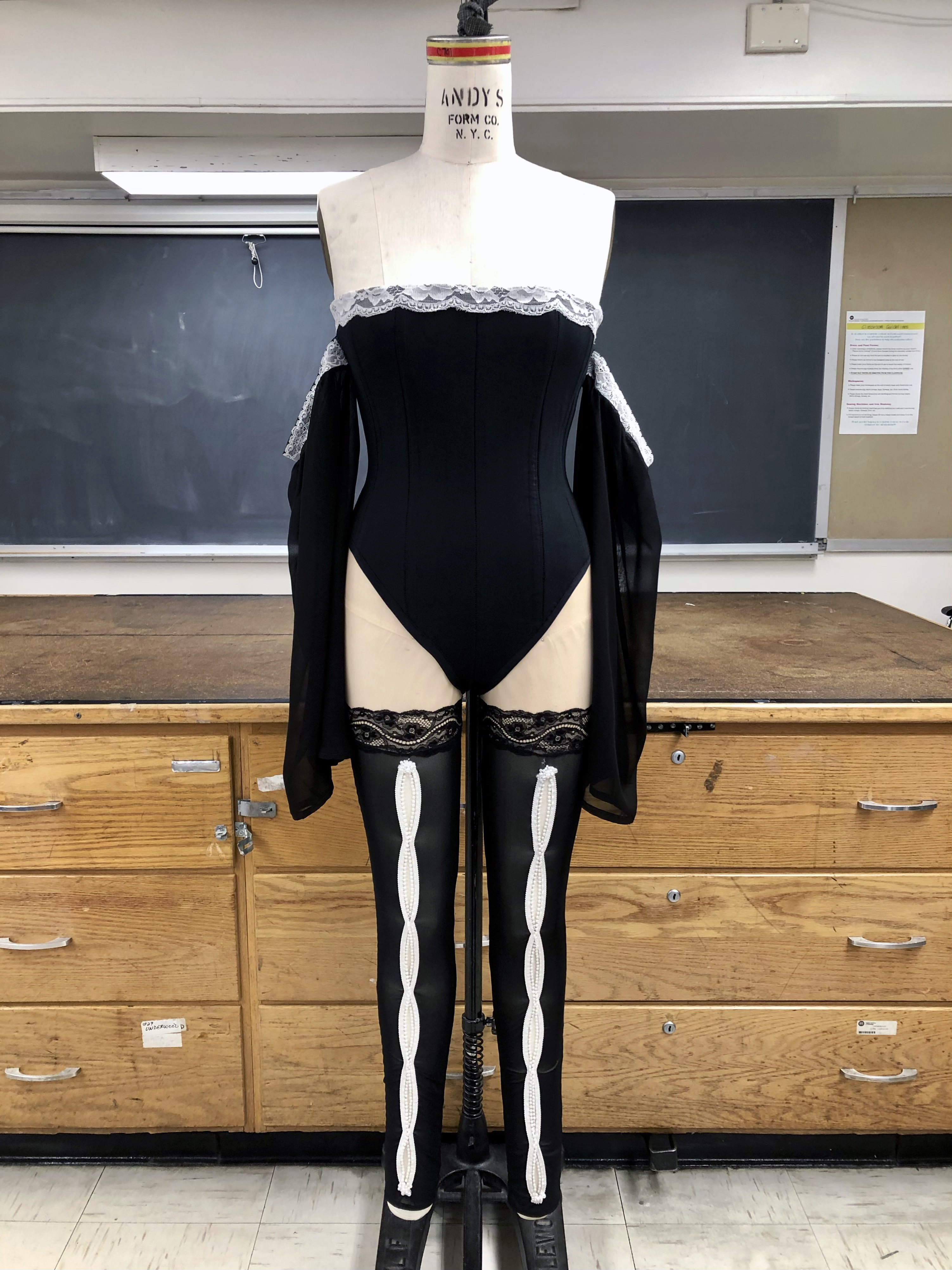 Boned body suit with chiffon bell sleeves and power mesh leggings