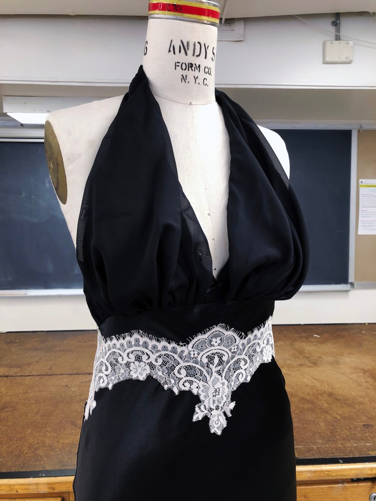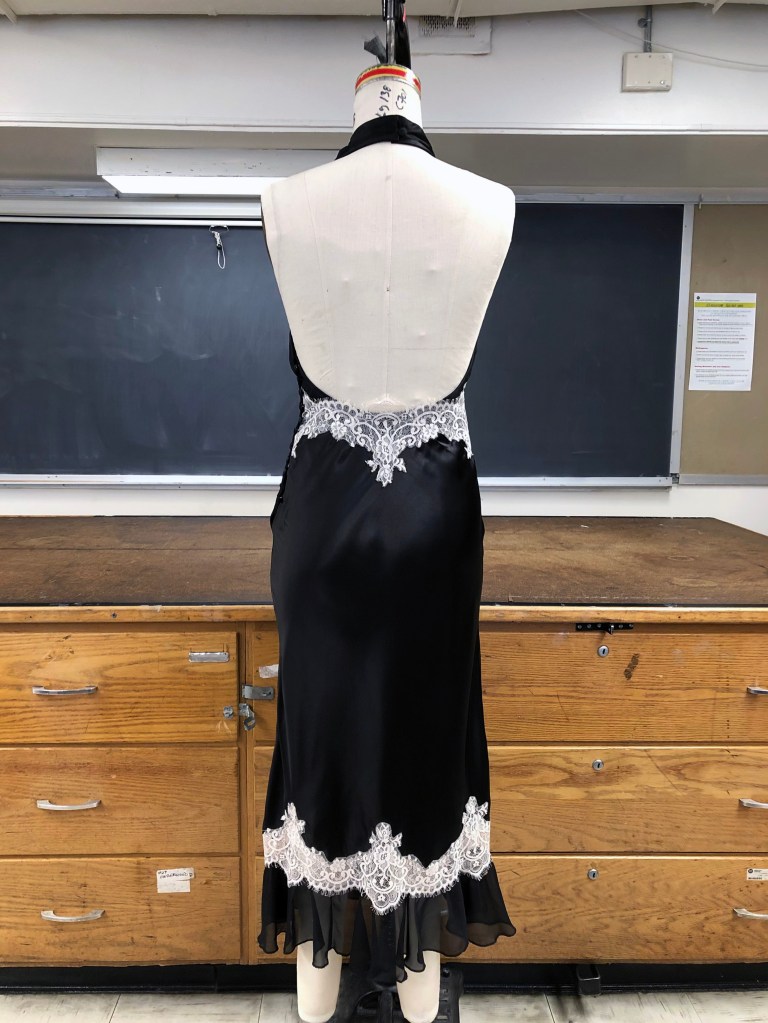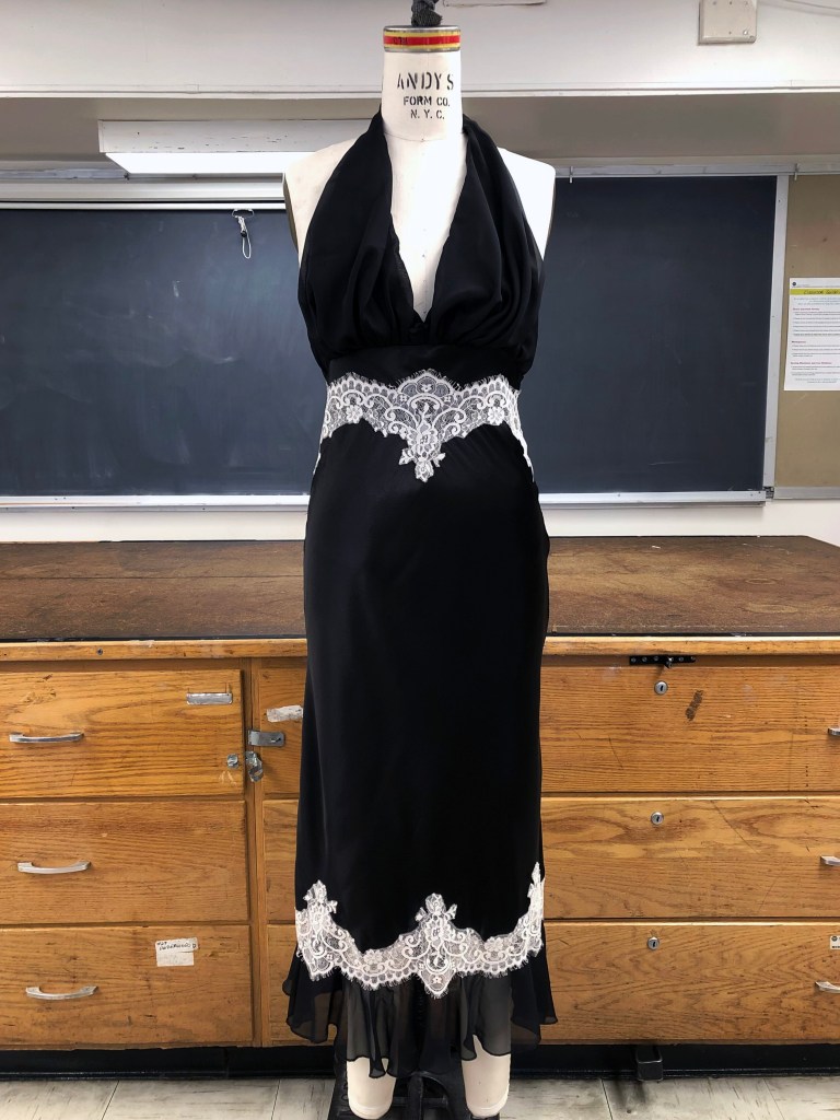Bias gown, made with polyester silk, chiffon, and lace appliqué.