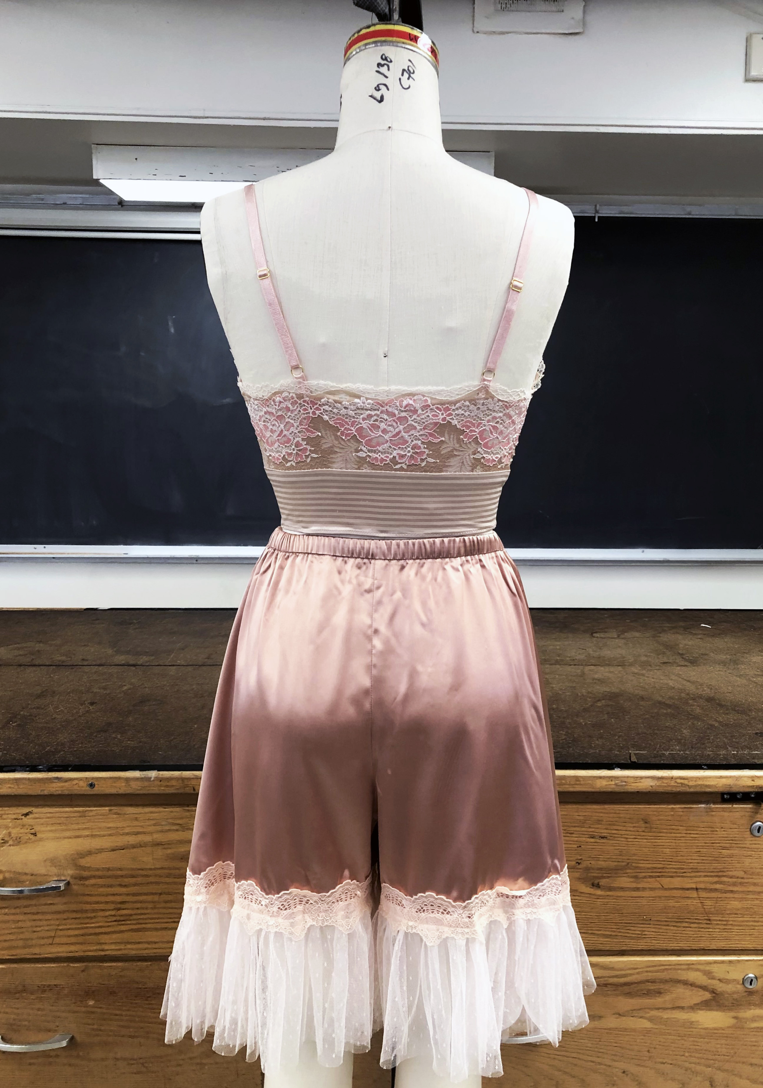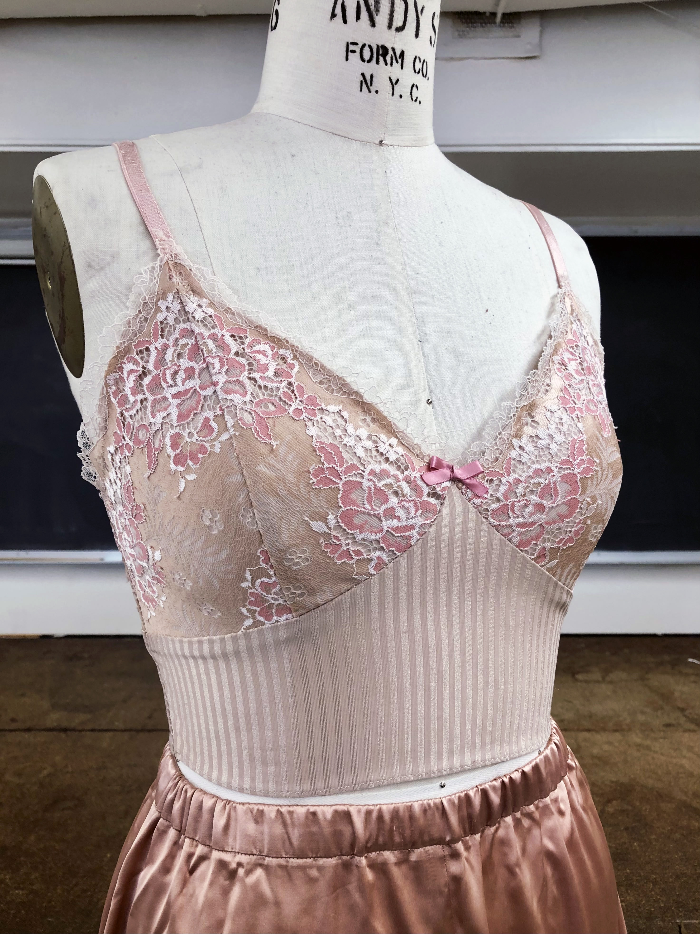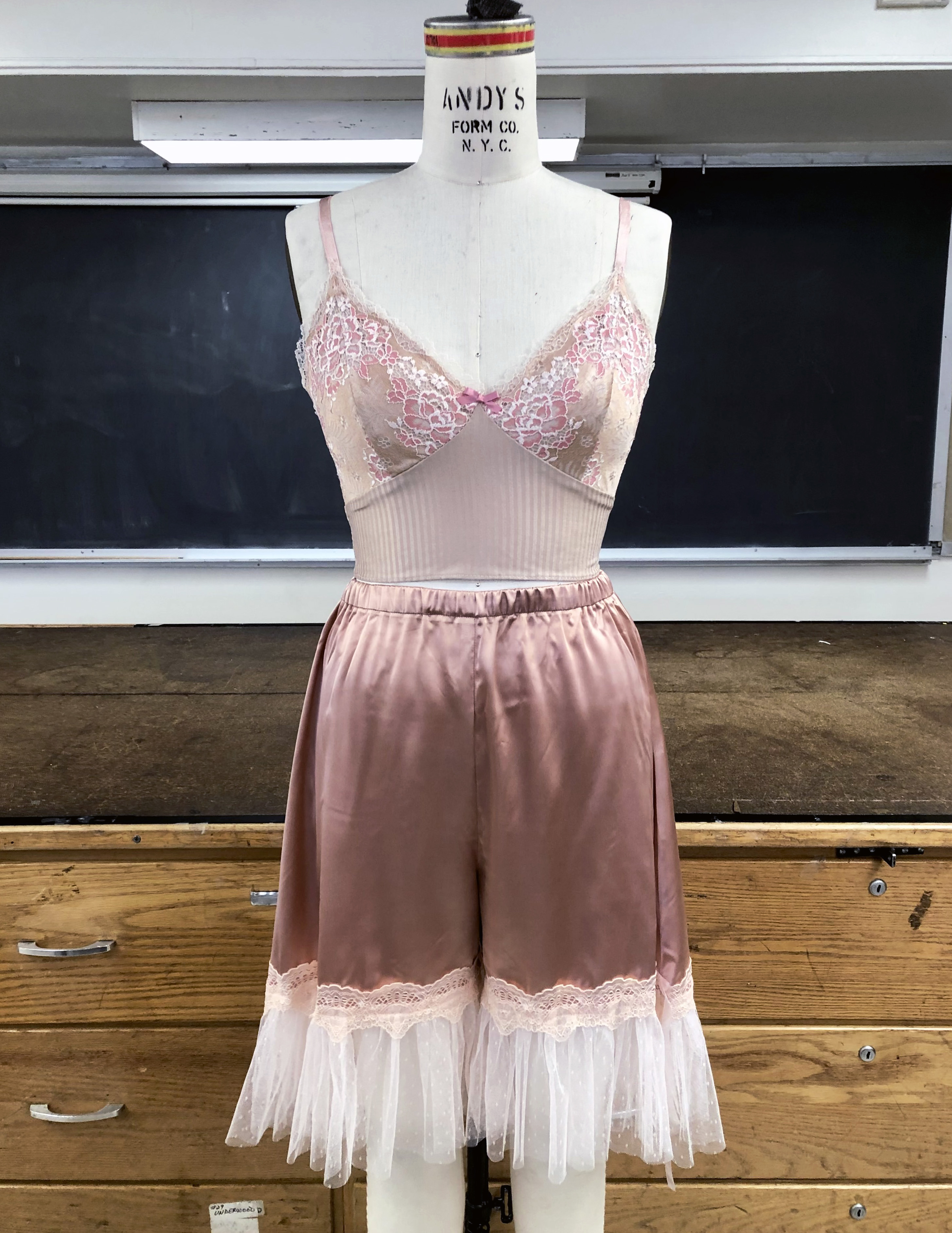Pajama set comprised of a lace spandex cami and silk charmeuse shorts.
