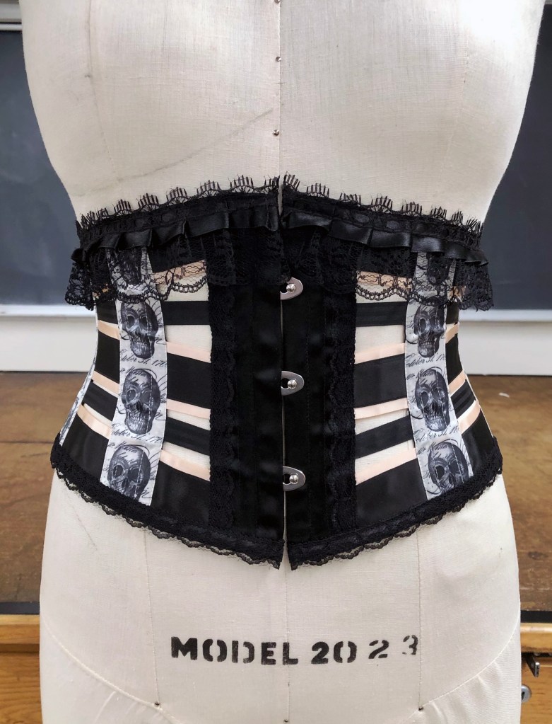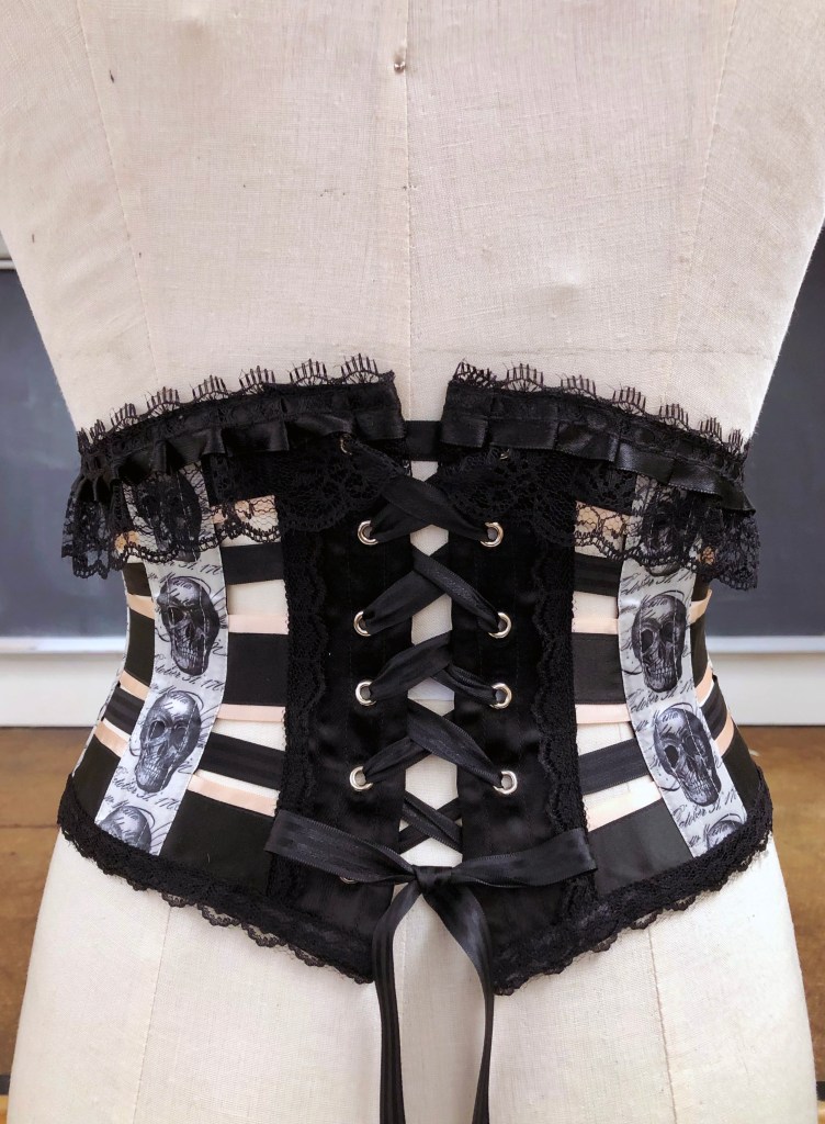 Satin ribbon corset with lace trim.